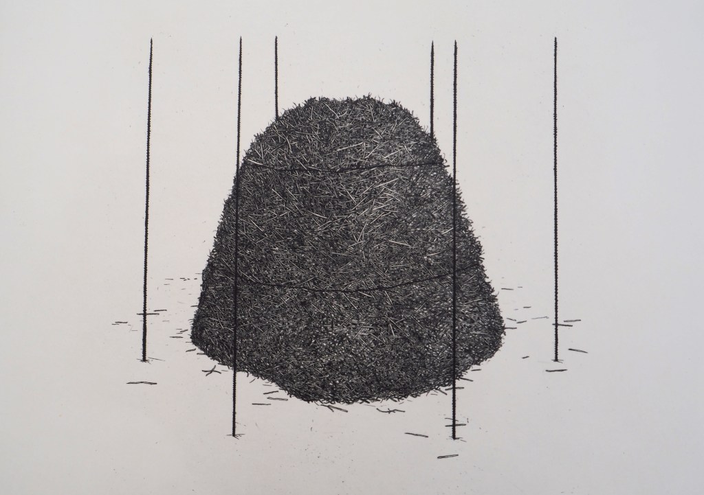 Ordre 01 : Tas – Recherche volume : Tas, paille, fer – Gravure sur cuivre, taille douce, chine-collé – 50x40cm, 2017.