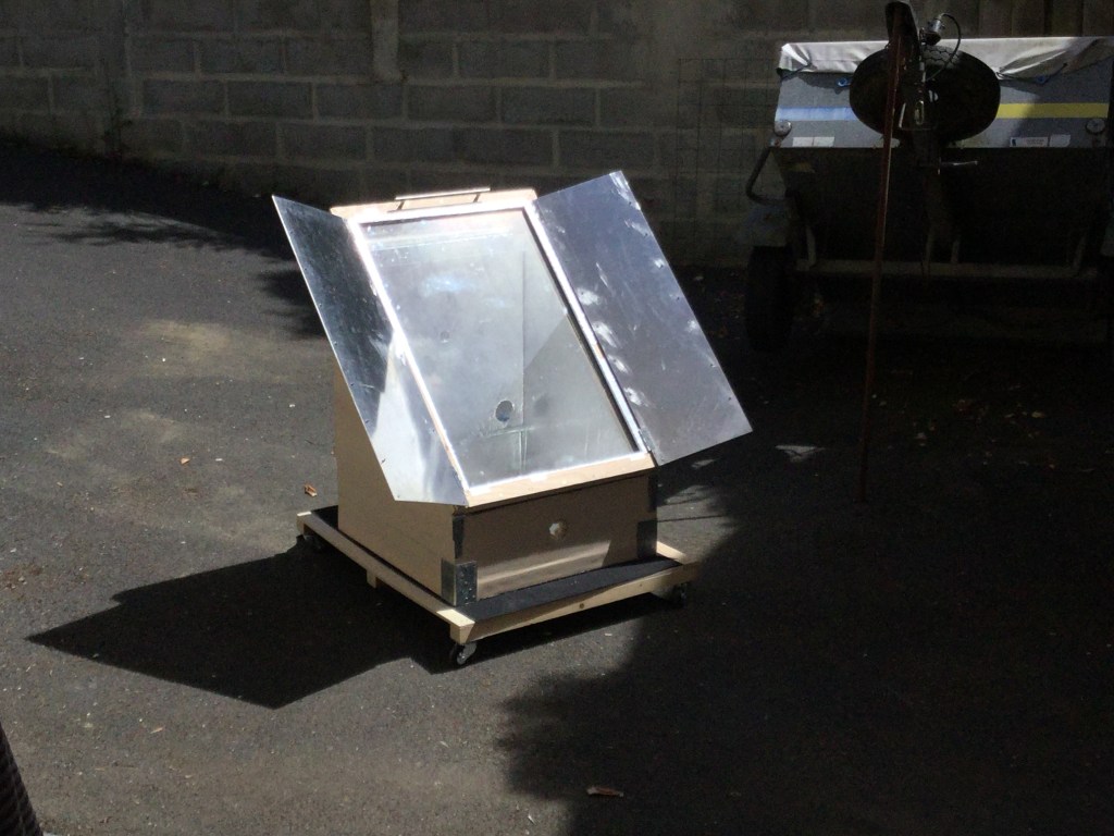 Le four solaire – cuiseur type boîte – est un réceptacle isolée thermiquement, composé d’une face avant vitrée et des parois intérieures réfléchissantes : Le principe consiste à concentrer les rayons solaires en un point – les réflecteurs guident et permettent la convergence du rayonnement.